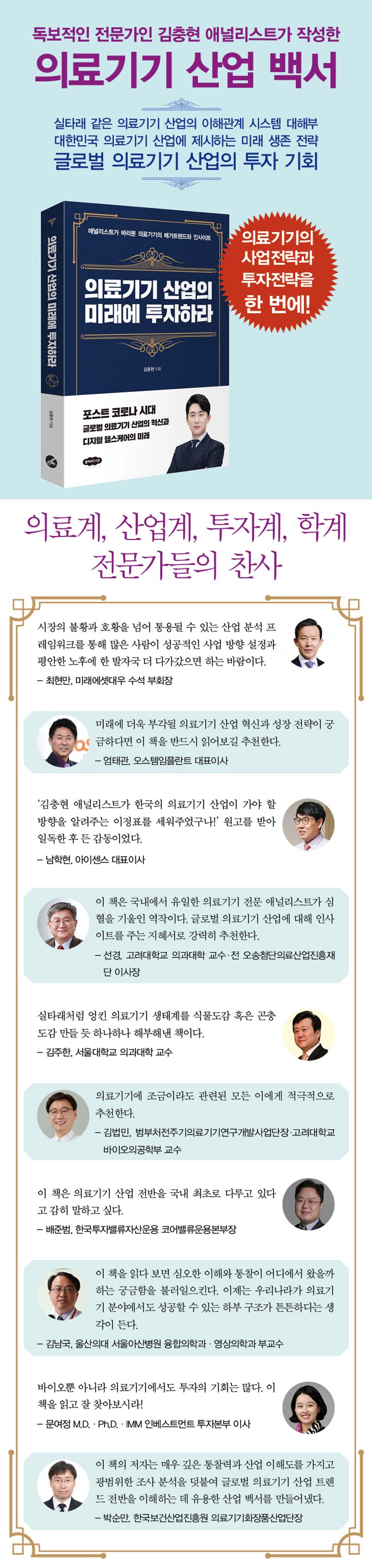 김충현 애널리스트는 매우 깊은 통찰력과 산업 이해도를 가지고 글로벌 의료기기 산업 전반을 이해할 수 있는 훌륭한 산업 백서를 만들어냈다. 이 책은 의료기기 분야에 몸담은 기업, 연구자, 학생, 투자자 등 많은 이들에게 실질적인 도움이 될 것으로 기대한다.