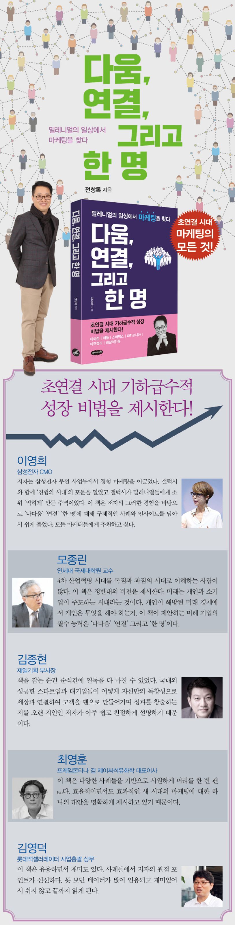 저자는 삼성전자 무선사업부에서 경험 마케팅을 이끌었다. 갤럭시와 함께 ‘경험의 시대’의 포문을 열었고 갤럭시가 밀레니얼들에게 소위 ‘먹히게’ 만든 주역이었다. 이 책은 저자의 경험을 바탕으로 ‘나다움’ ‘연결’ ‘한 명’에 대해 구체적인 사례와 본인 경험을 기반으로 한 인사이트를 담아서 쉽게 풀었다. 그야말로 ‘저자다운 진정성’을 듬뿍 담아 정성스레 정리한 마케팅 지침서이다. 새롭게 시장을 개척하고 싶은 모든 마케터들에게 추천하고 싶다.
