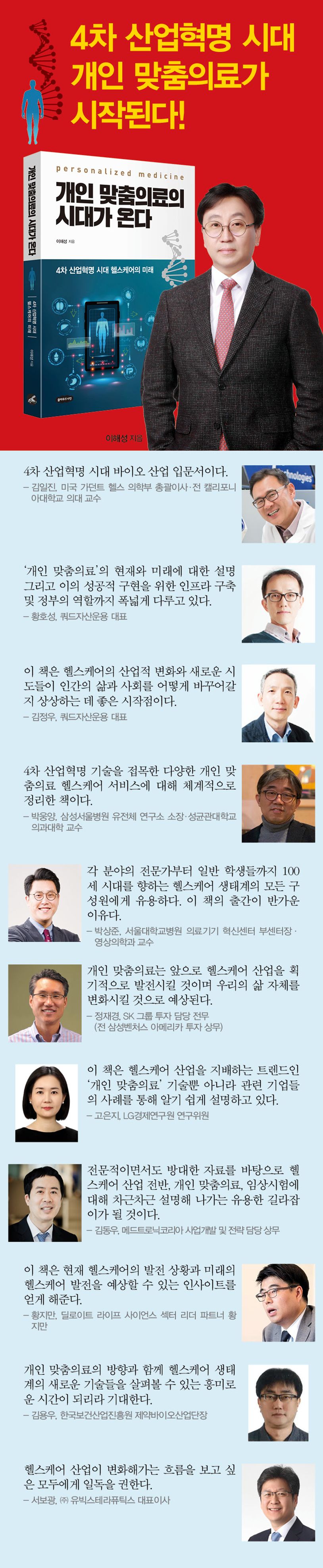 개인 맞춤의료는 앞으로 헬스케어 산업을 획기적으로 발전시킬 것이며 우리의 삶 자체를 변화시킬 것으로 예상된다. 이 책은 광범위한 분야를 아우르면서 동시에 미래의 트렌드와 기술을 깊이 있게 분석하고 있다. 전문가뿐만 아니라 새로 입문하는 독자들도 쉽게 이해할 수 있게 되어 있다.